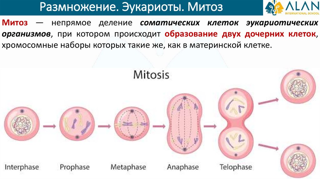 Размножение. Эукариоты. МитозМитоз — непрямое деление соматических клеток эукариотических