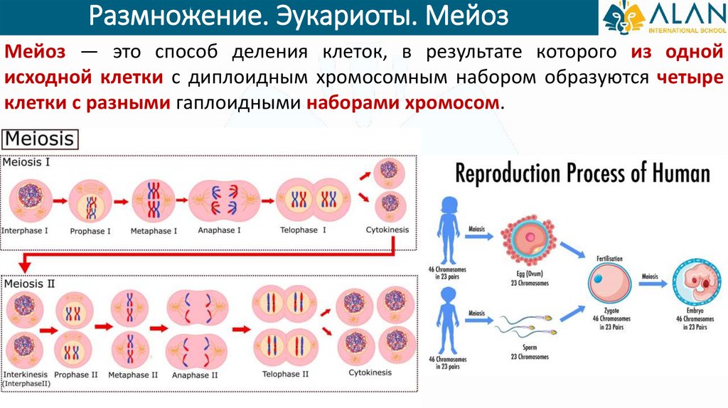 Размножение. Эукариоты. МейозМейоз — это способ деления клеток, в результате которого из одной