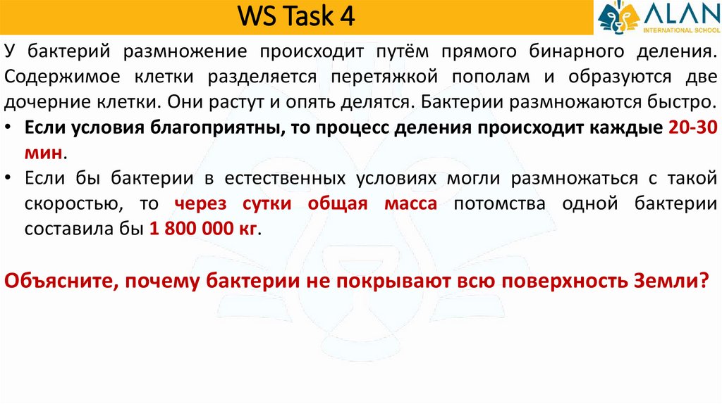 WS Task 4У бактерий размножение происходит путём прямого бинарного деления.
