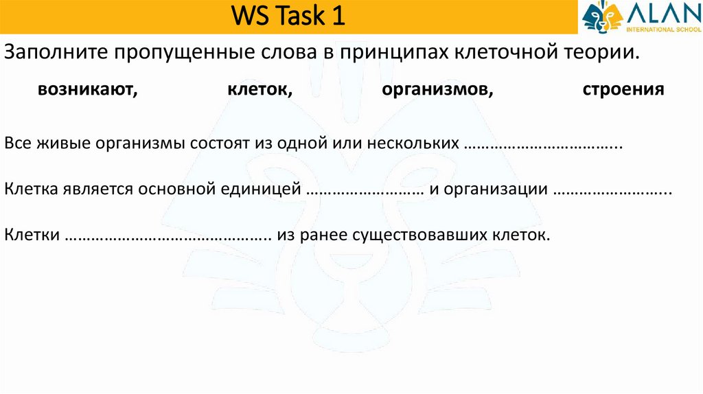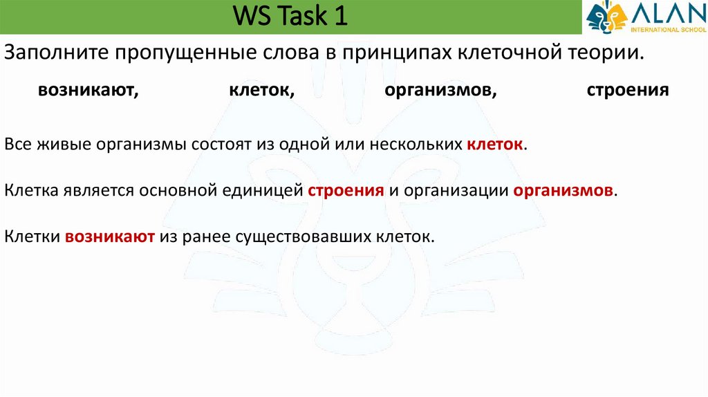 WS Task 1Заполните пропущенные слова в принципах клеточной теории.