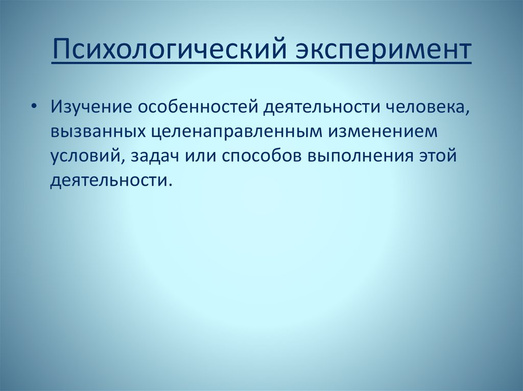 Психологический эксперимент• Изучение особенностей деятельности человека,