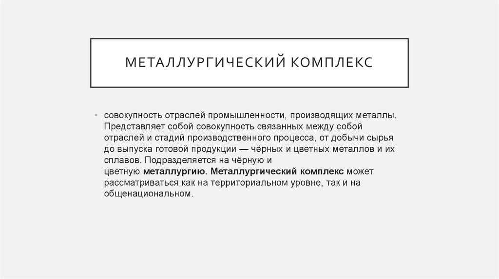 МЕТАЛЛУРГИЧЕСКИЙ КОМПЛЕКС• совокупность отраслей промышленности, производящих металлы.