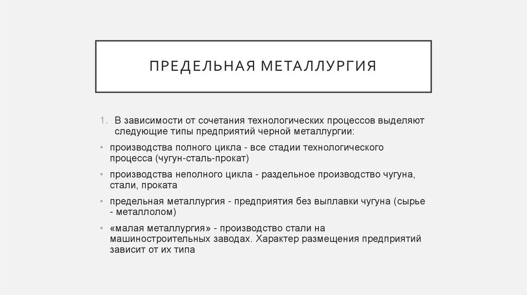 • предельная металлургия - предприятия без выплавки чугуна (сырье