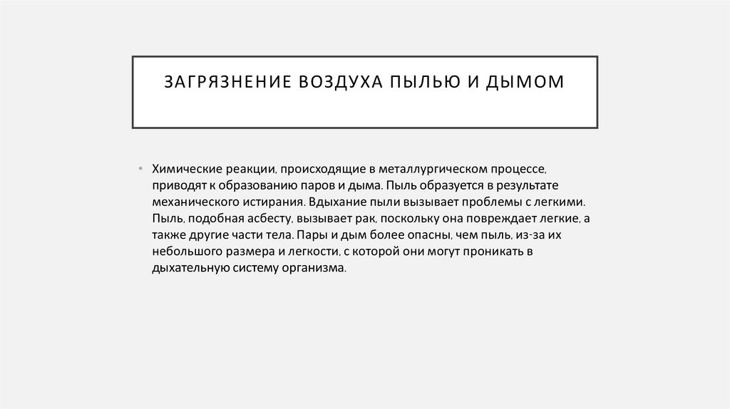 ЗАГРЯЗНЕНИЕ ВОЗДУХА ПЫЛЬЮ И ДЫМОМ• Химические реакции, происходящие в металлургическом процессе,