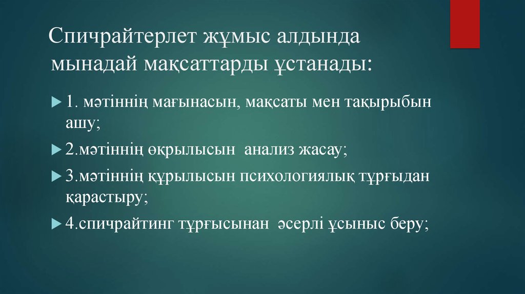 7. Спичрайтерлет жұмыс алдында мынадай мақсаттарды ұстанады: