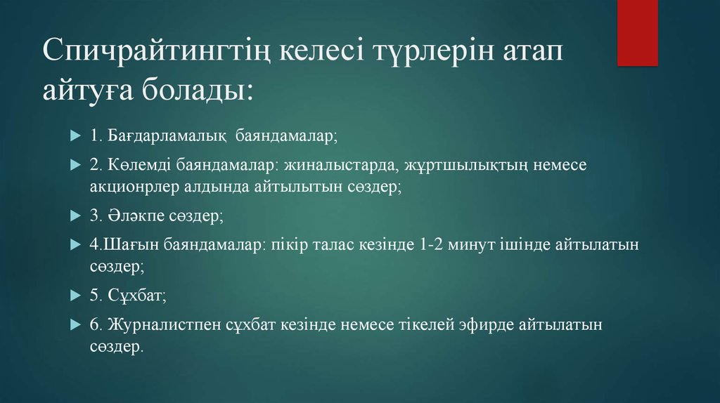 9. Спичрайтингтің келесі түрлерін атап айтуға болады: