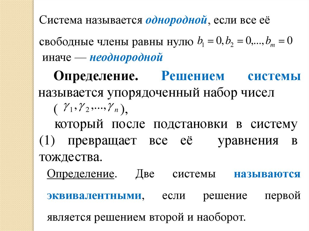 Система называется однородной, если все еёсвободные члены равны нулю b1 0, b2 0,..., bm 0