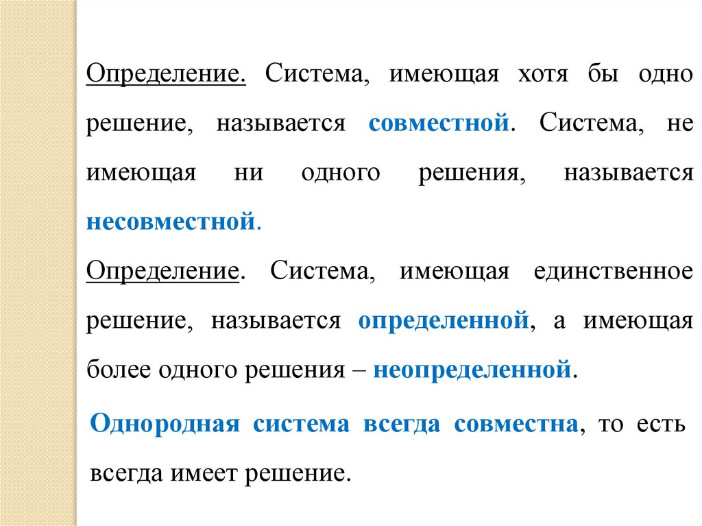 Определение. Система, имеющая хотя бы однорешение, называется совместной. Система, не