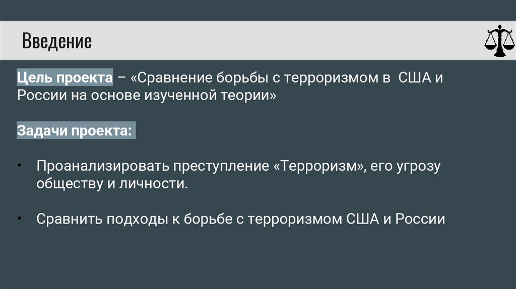 ВведениеЦель проекта – «Сравнение борьбы с терроризмом в США и