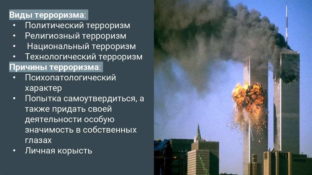 Виды терроризма:• Политический терроризм