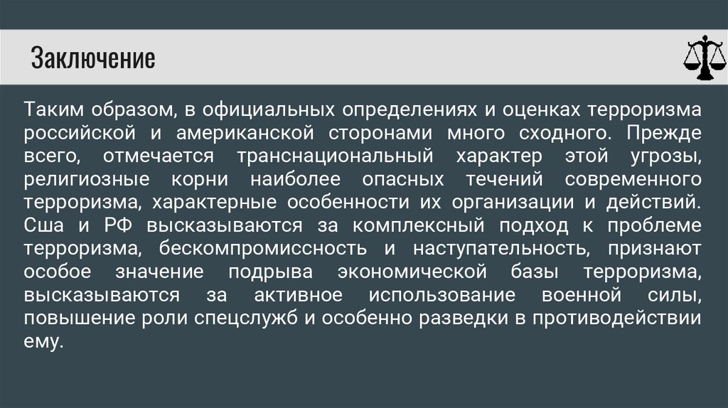ЗаключениеТаким образом, в официальных определениях и оценках терроризма