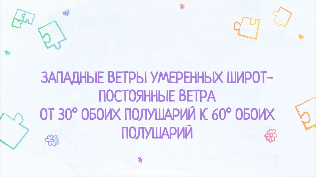 ЗАПАДНЫЕ ВЕТРЫ УМЕРЕННЫХ ШИРОТПОСТОЯННЫЕ ВЕТРАОТ 30° ОБОИХ ПОЛУШАРИЙ К 60° ОБОИХ
