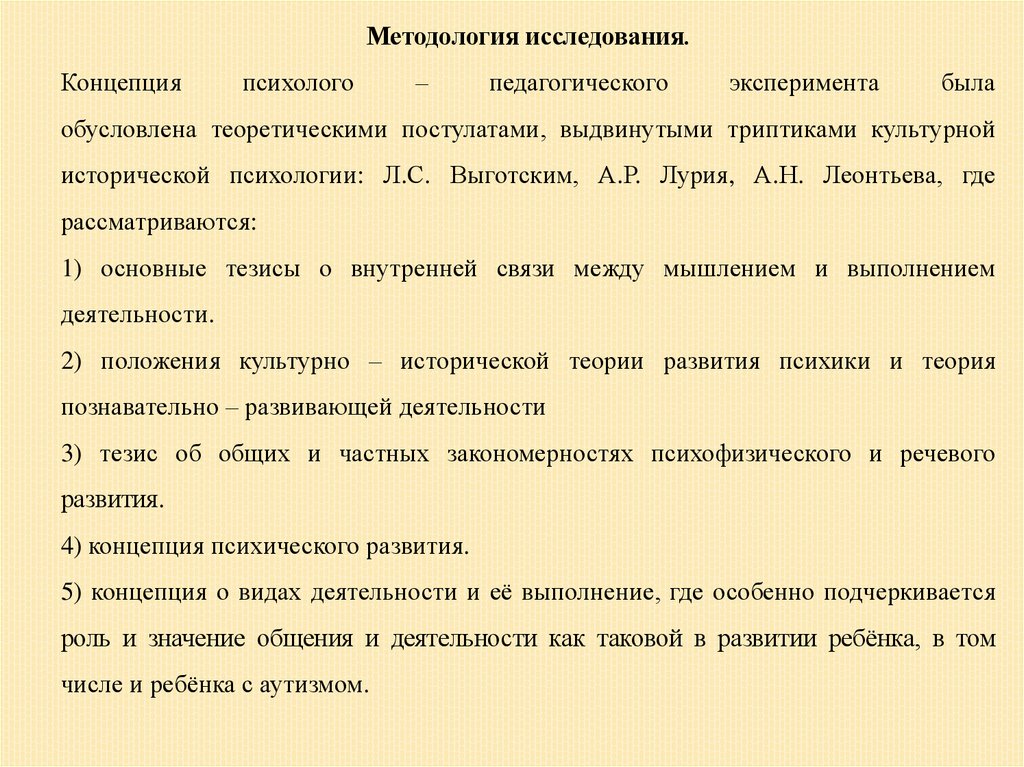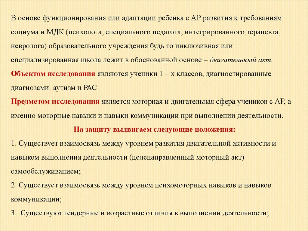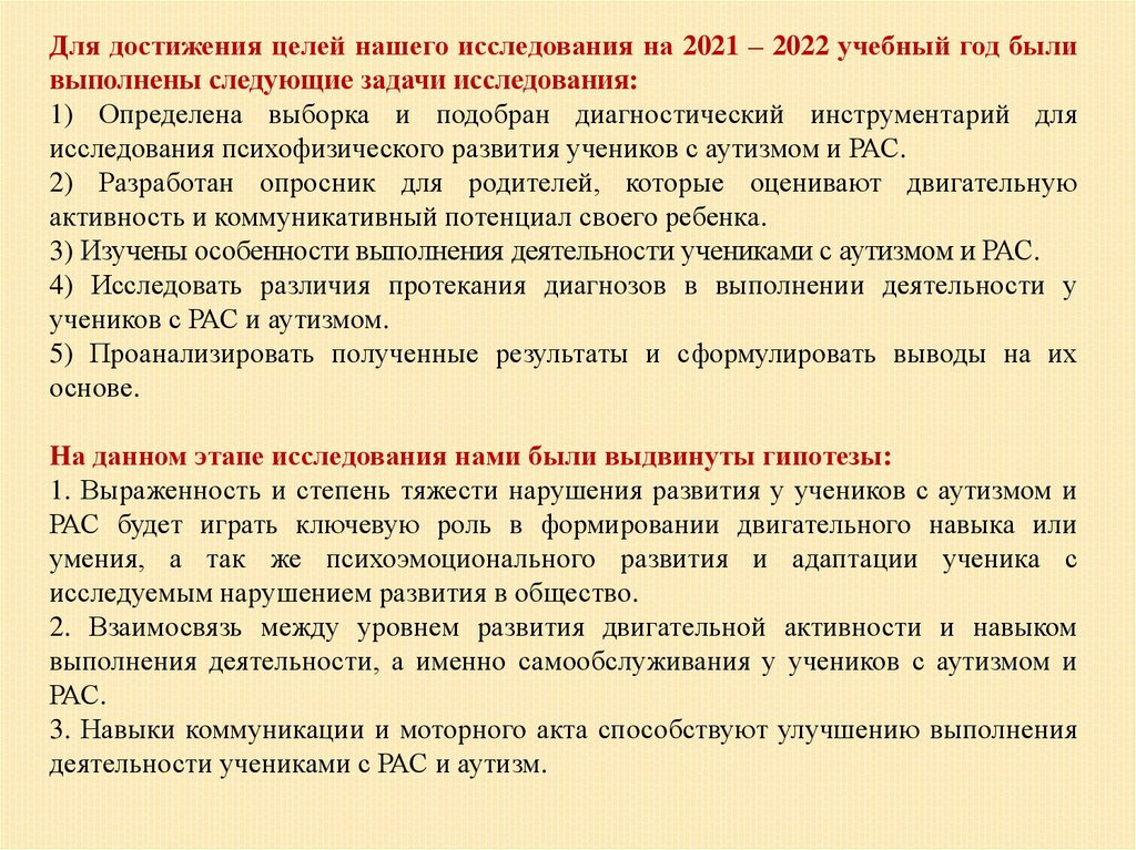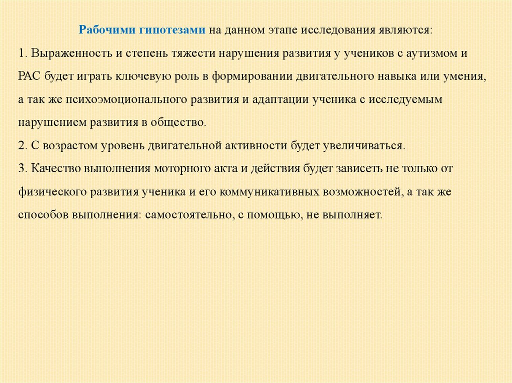 Рабочими гипотезами на данном этапе исследования являются:1. Выраженность и степень тяжести нарушения развития у учеников с аутизмом и