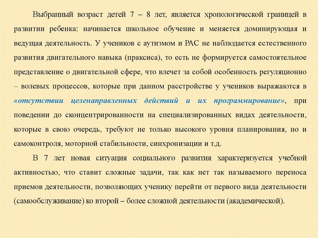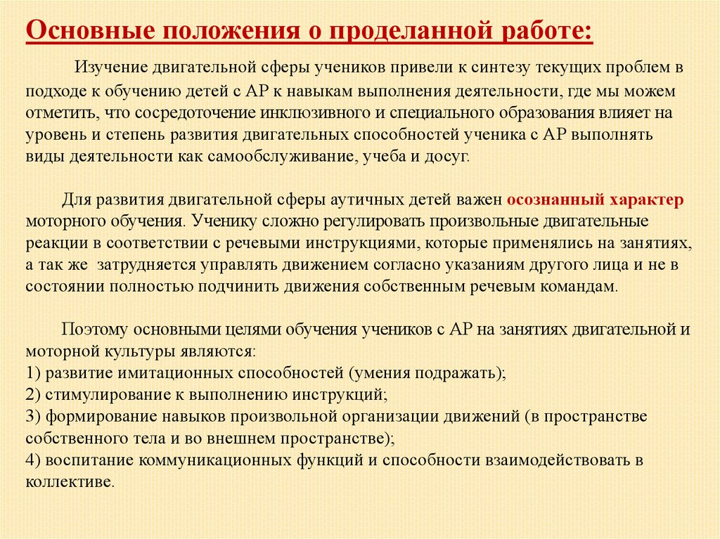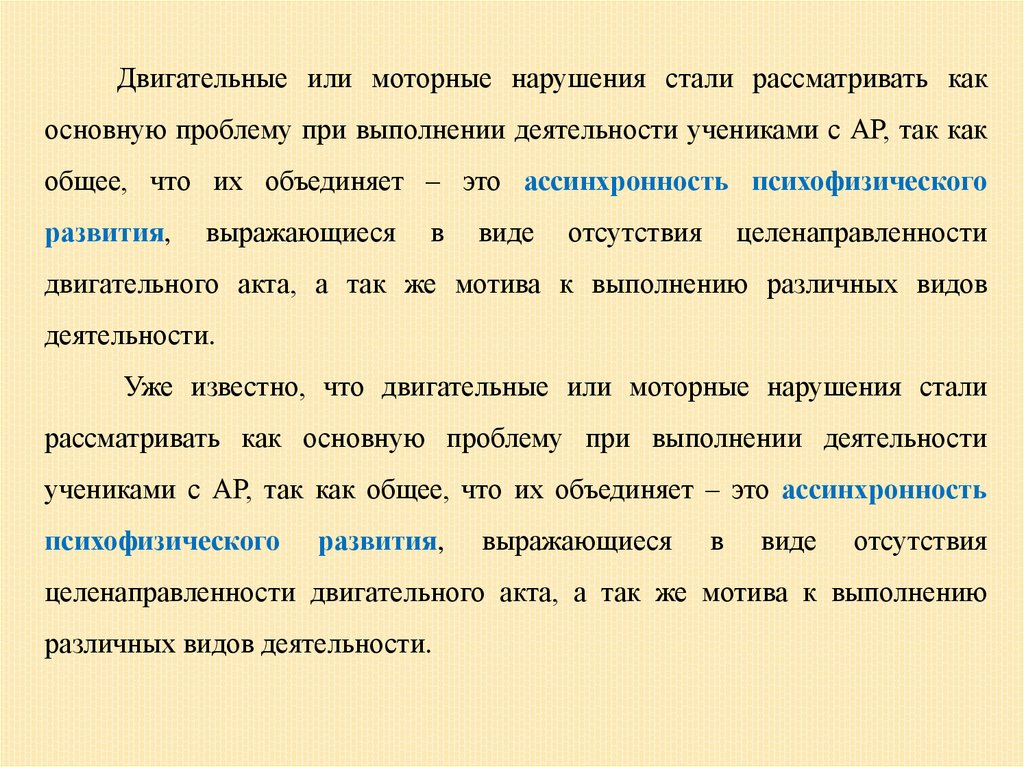 Двигательные или моторные нарушения стали рассматривать какосновную проблему при выполнении деятельности учениками с АР, так как