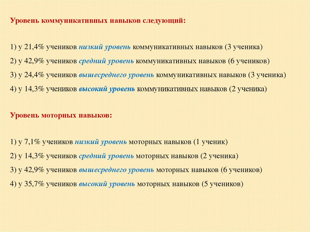 Уровень коммуникативных навыков следующий:1) у 21,4% учеников низкий уровень коммуникативных навыков (3 ученика)