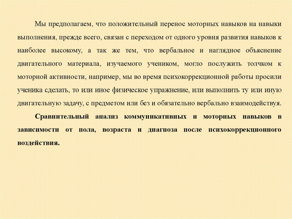 Мы предполагаем, что положительный перенос моторных навыков на навыкивыполнения, прежде всего, связан с переходом от одного уровня развития навыков к
