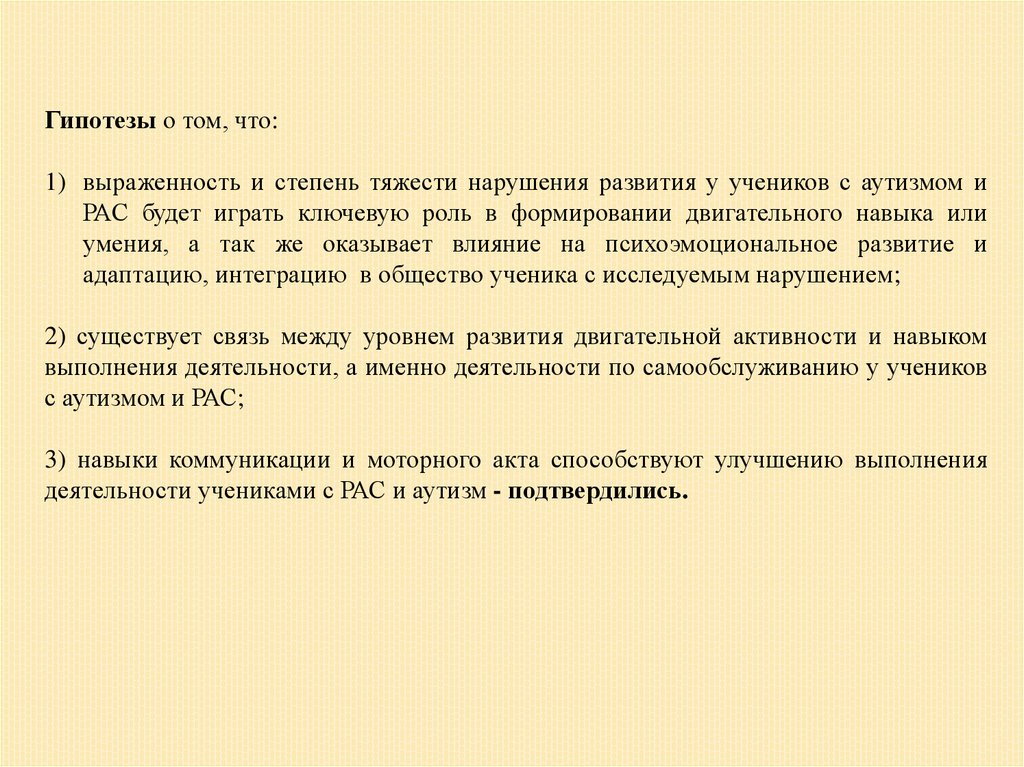 Гипотезы о том, что:1) выраженность и степень тяжести нарушения развития у учеников с аутизмом и