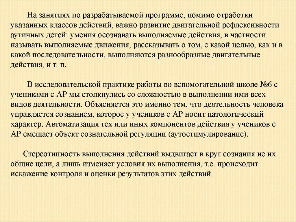 аутичных детей: умения осознавать выполняемые действия, в частности
