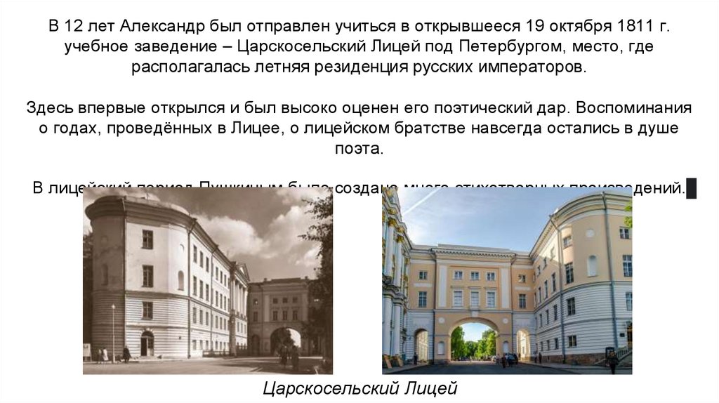 В 12 лет Александр был отправлен учиться в открывшееся 19 октября 1811 г.учебное заведение – Царскосельский Лицей под Петербургом, место, где