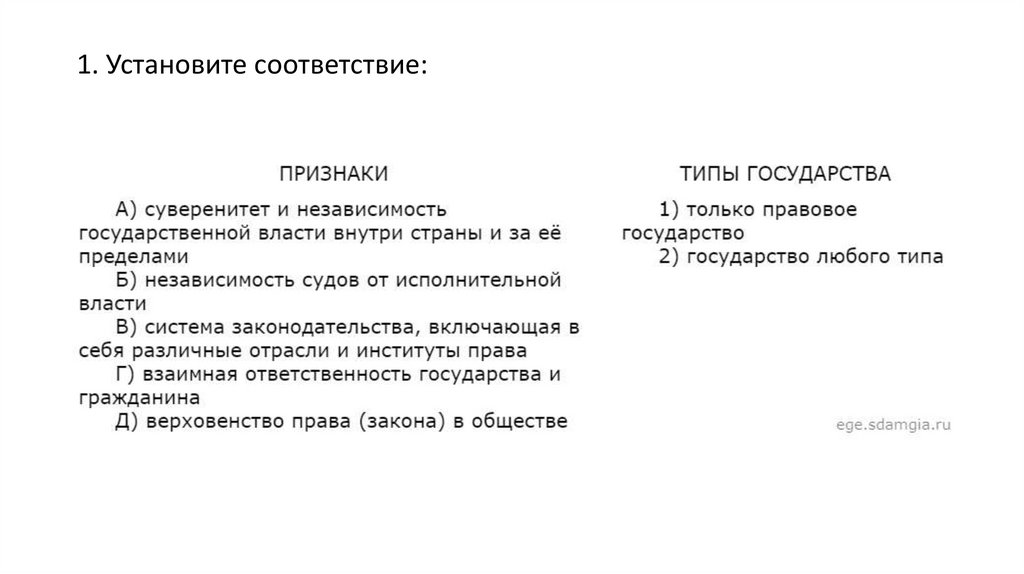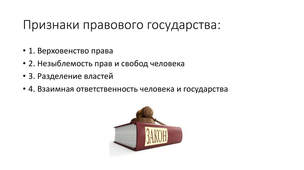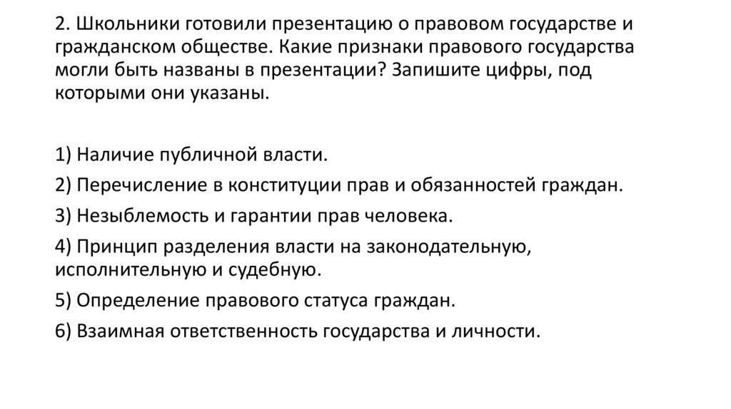 2. Школьники готовили презентацию о правовом государстве игражданском обществе. Какие признаки правового государства