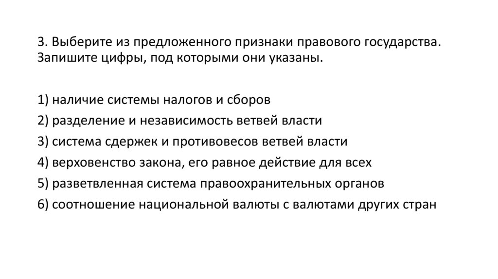 3. Выберите из предложенного признаки правового государства.Запишите цифры, под которыми они указаны.