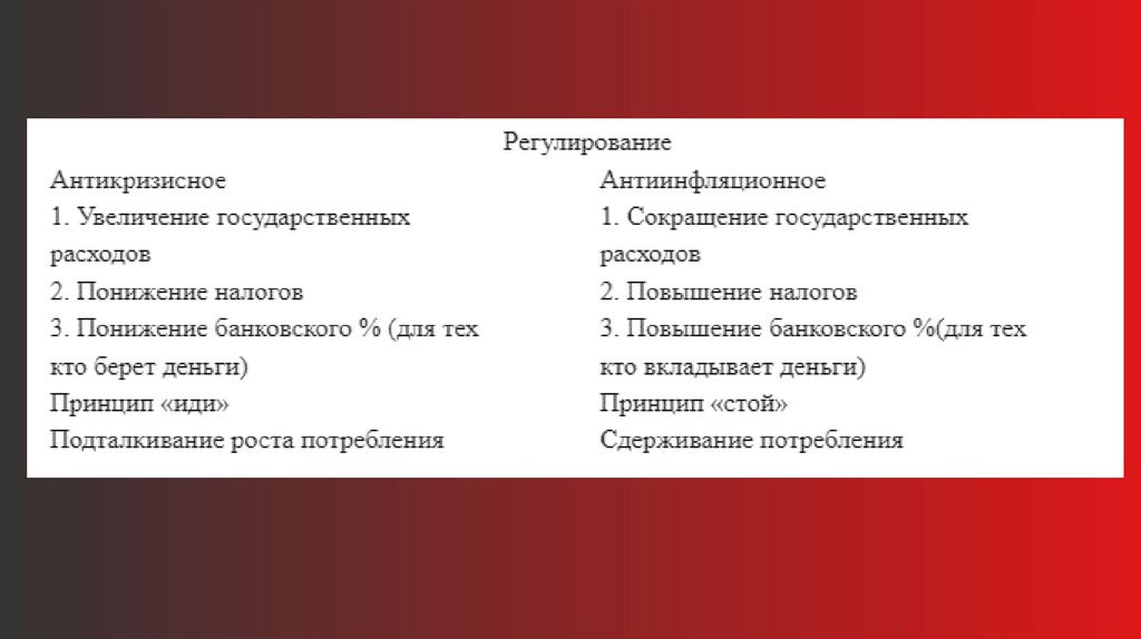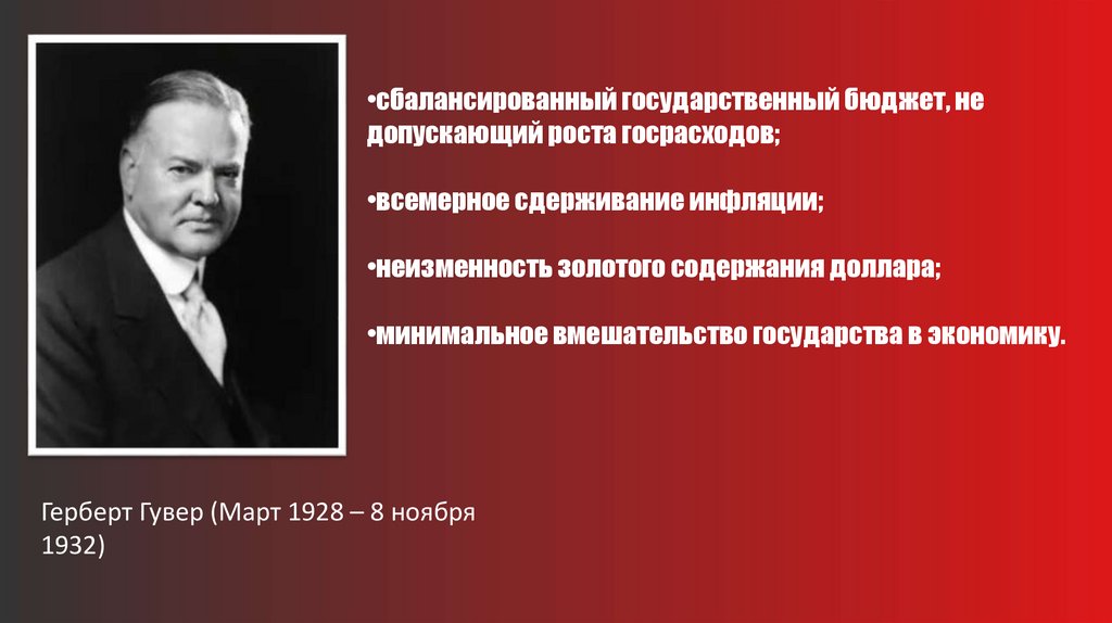 •сбалансированный государственный бюджет, недопускающий роста госрасходов;