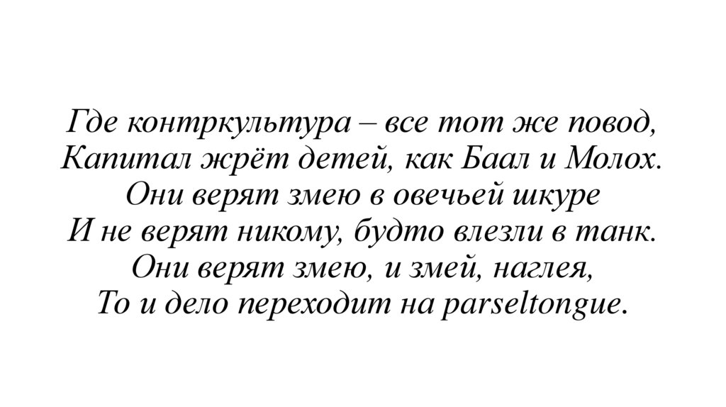 Где контркультура – все тот же повод,Капитал жрёт детей, как Баал и Молох.