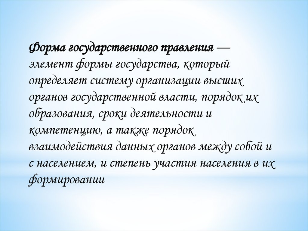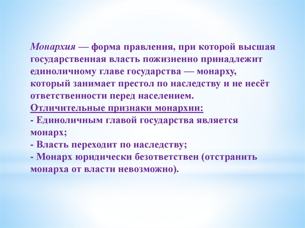 Монархия — форма правления, при которой высшаягосударственная власть пожизненно принадлежит