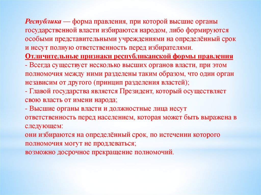 Республика — форма правления, при которой высшие органыгосударственной власти избираются народом, либо формируются
