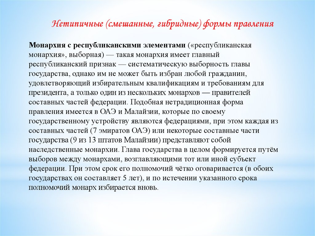 Нетипичные (смешанные, гибридные) формы правленияМонархия с республиканскими элементами («республиканская