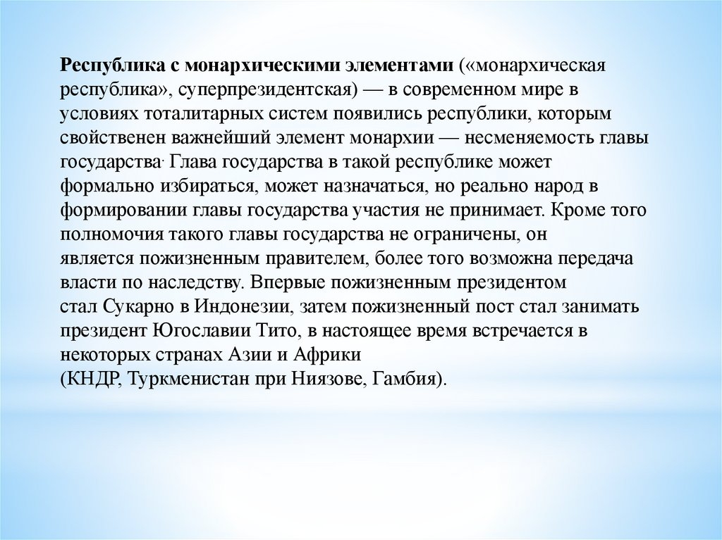 Республика с монархическими элементами («монархическаяреспублика», суперпрезидентская) — в современном мире в