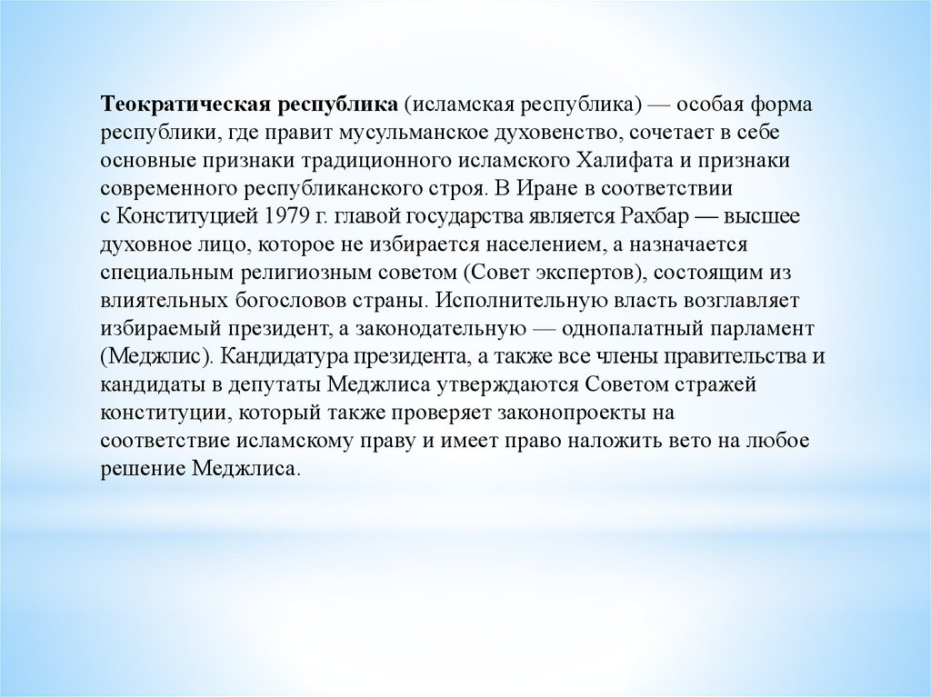 Теократическая республика (исламская республика) — особая формареспублики, где правит мусульманское духовенство, сочетает в себе