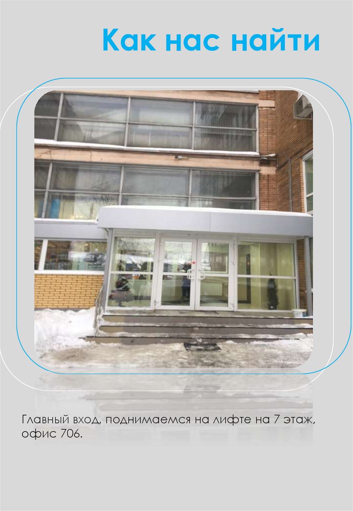 Как нас найтиГлавный вход, поднимаемся на лифте на 7 этаж,