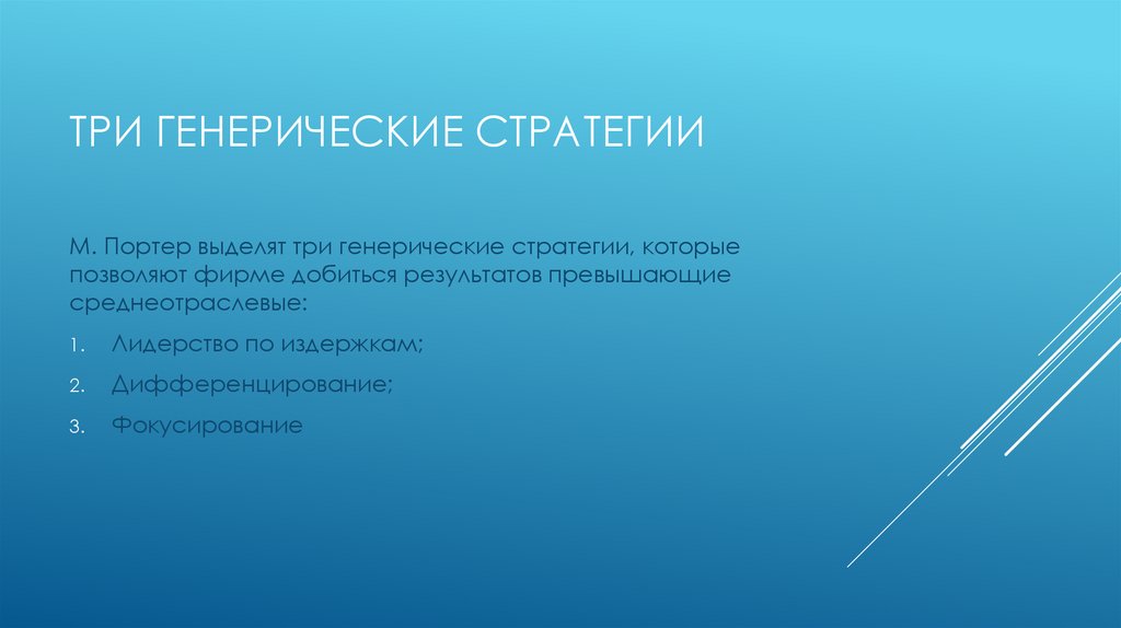 ТРИ ГЕНЕРИЧЕСКИЕ СТРАТЕГИИМ. Портер выделят три генерические стратегии, которые