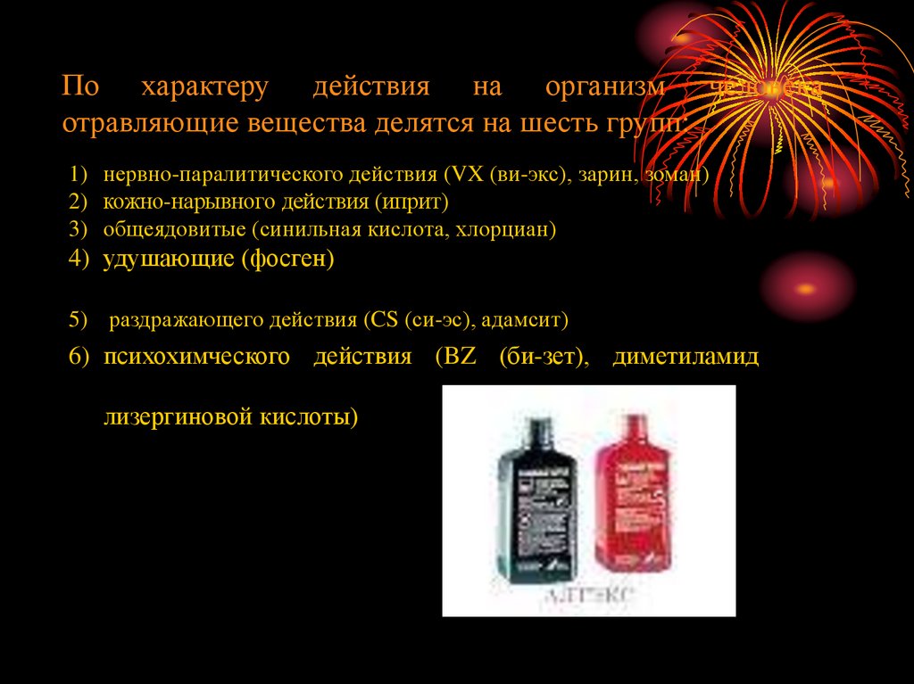 По характеру действия на организм человекаотравляющие вещества делятся на шесть групп: