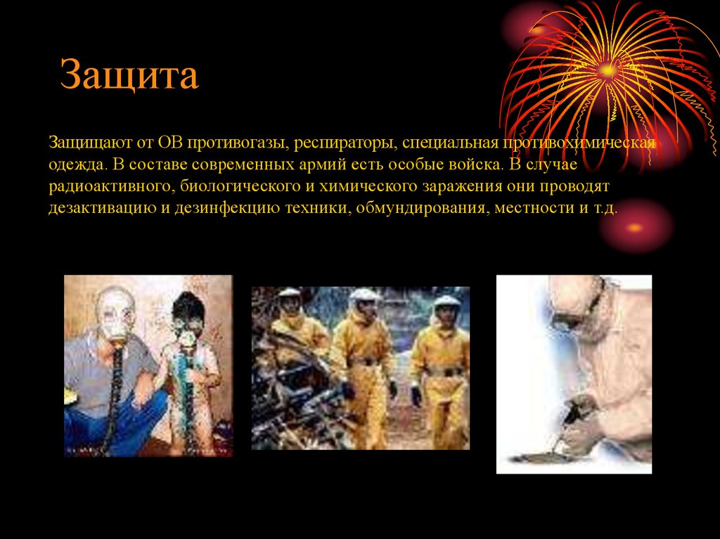 ЗащитаЗащищают от ОВ противогазы, респираторы, специальная противохимическая