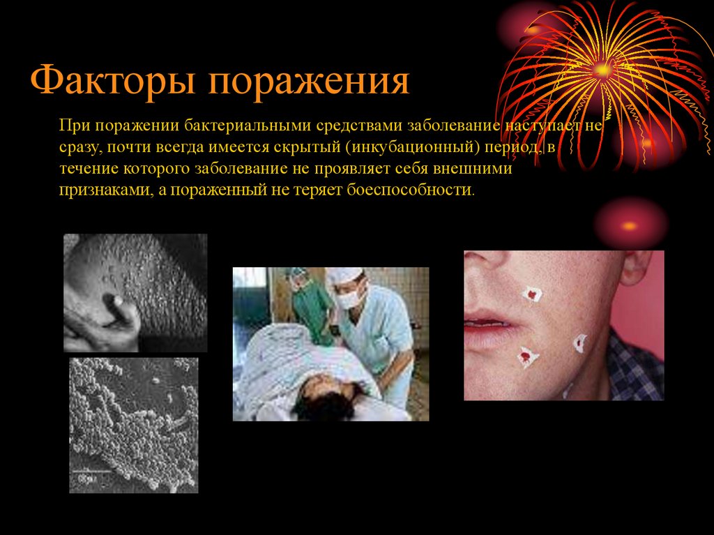 Факторы пораженияПри поражении бактериальными средствами заболевание наступает не