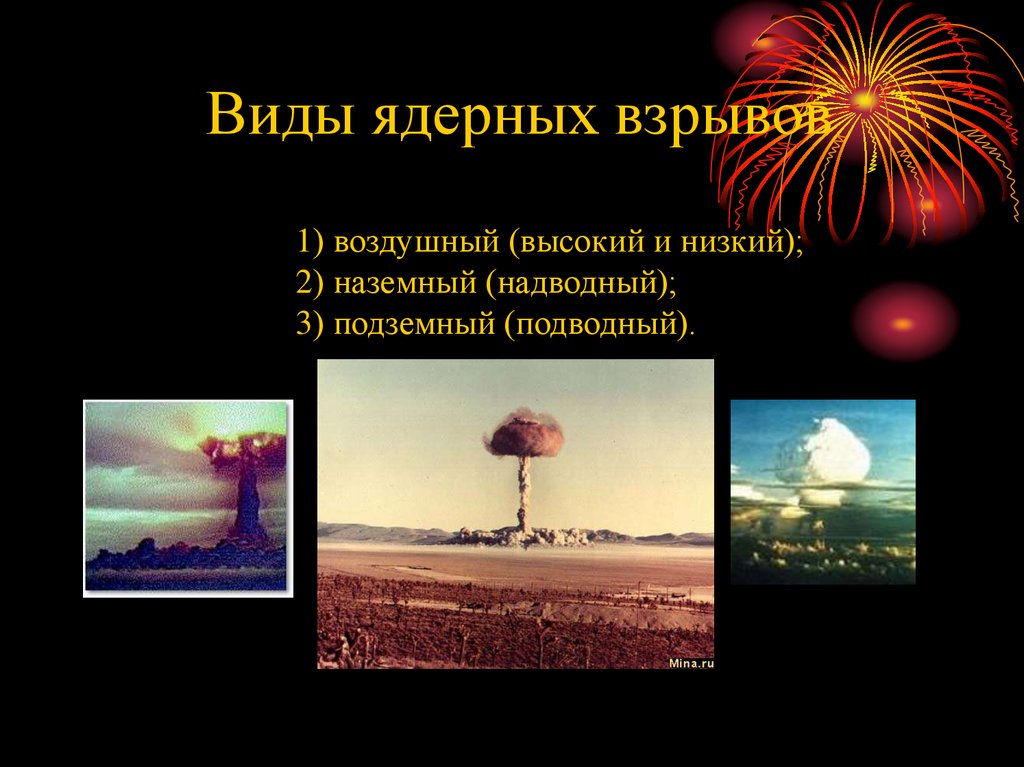 Виды ядерных взрывов1) воздушный (высокий и низкий);