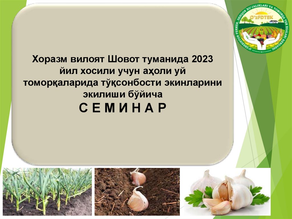 Хоразм вилоят Шовот туманида 2023 йил хосили учун аҳоли уй томорқаларида тўқсонбости экинларини экилиши бўйича