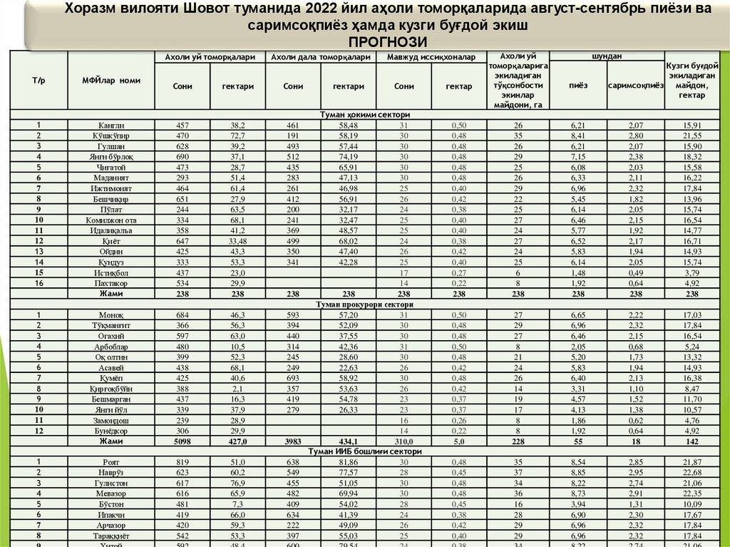 Хоразм вилояти Шовот туманида 2022 йил аҳоли томорқаларида август-сентябрь пиёзи васаримсоқпиёз ҳамда кузги буғдой экиш