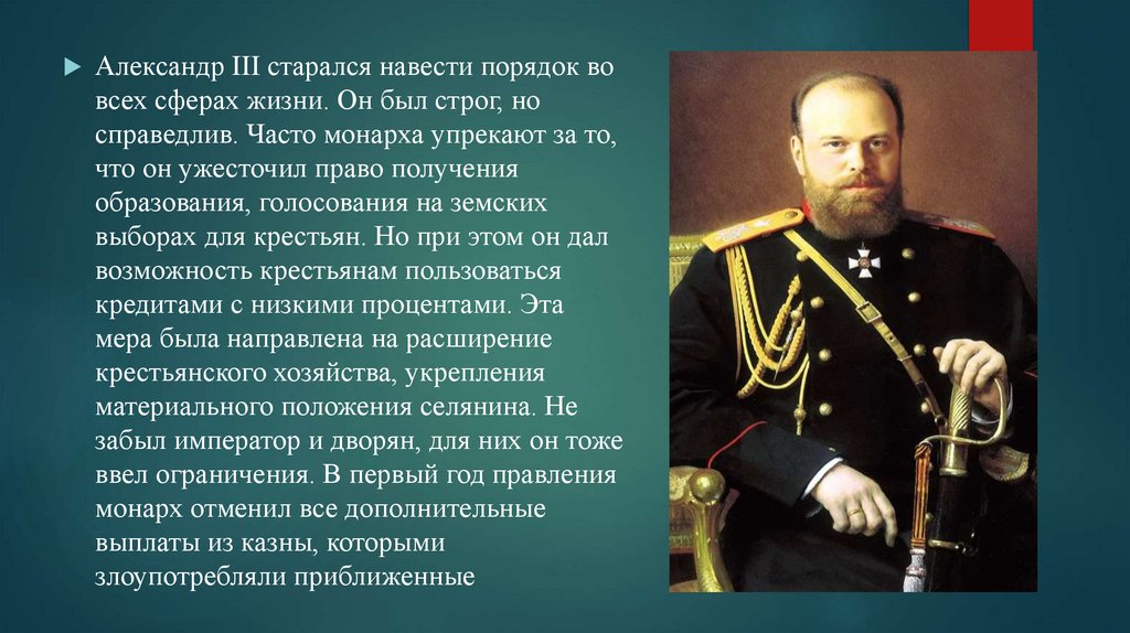 Александр III старался навести порядок вовсех сферах жизни. Он был строг, но