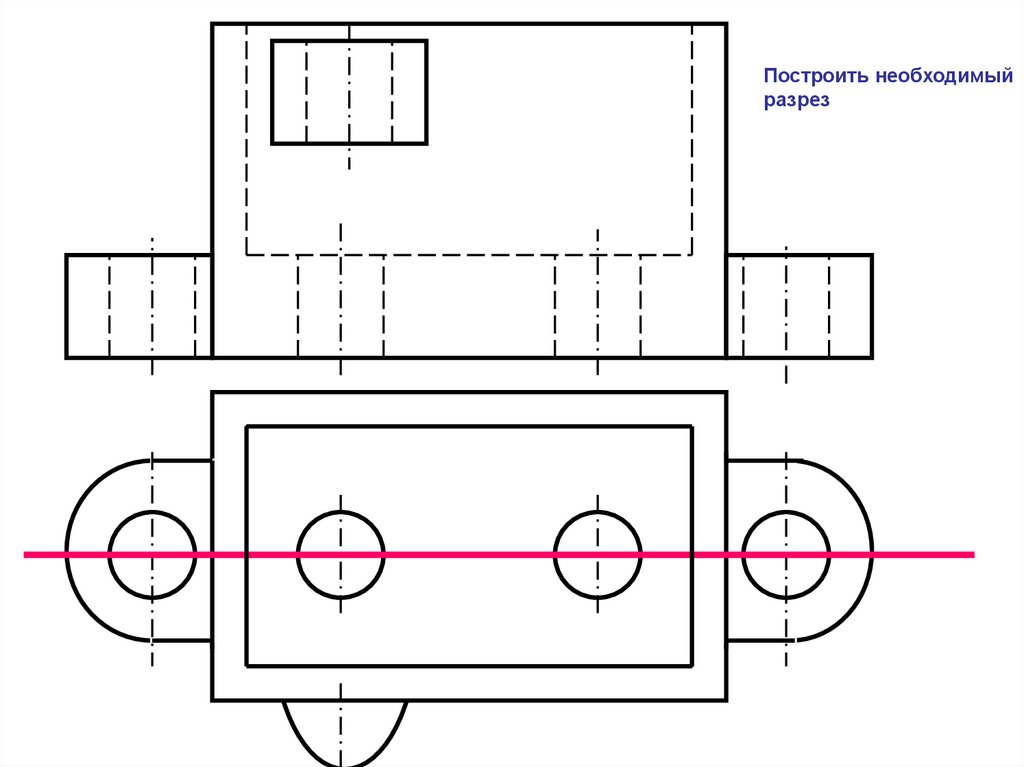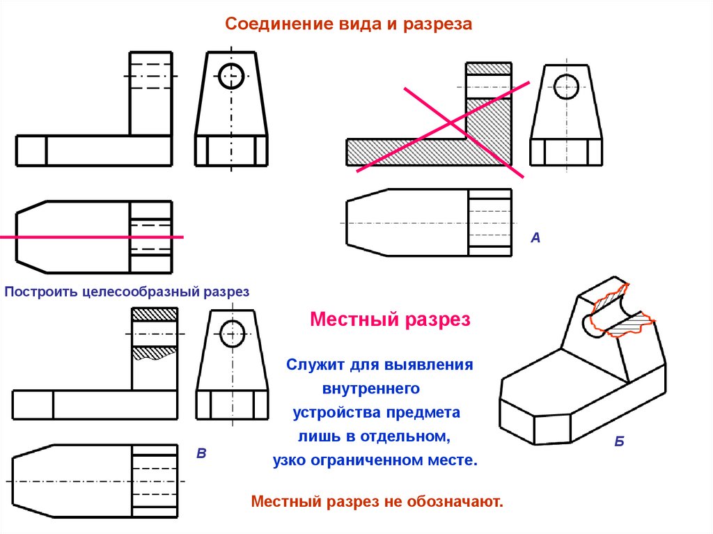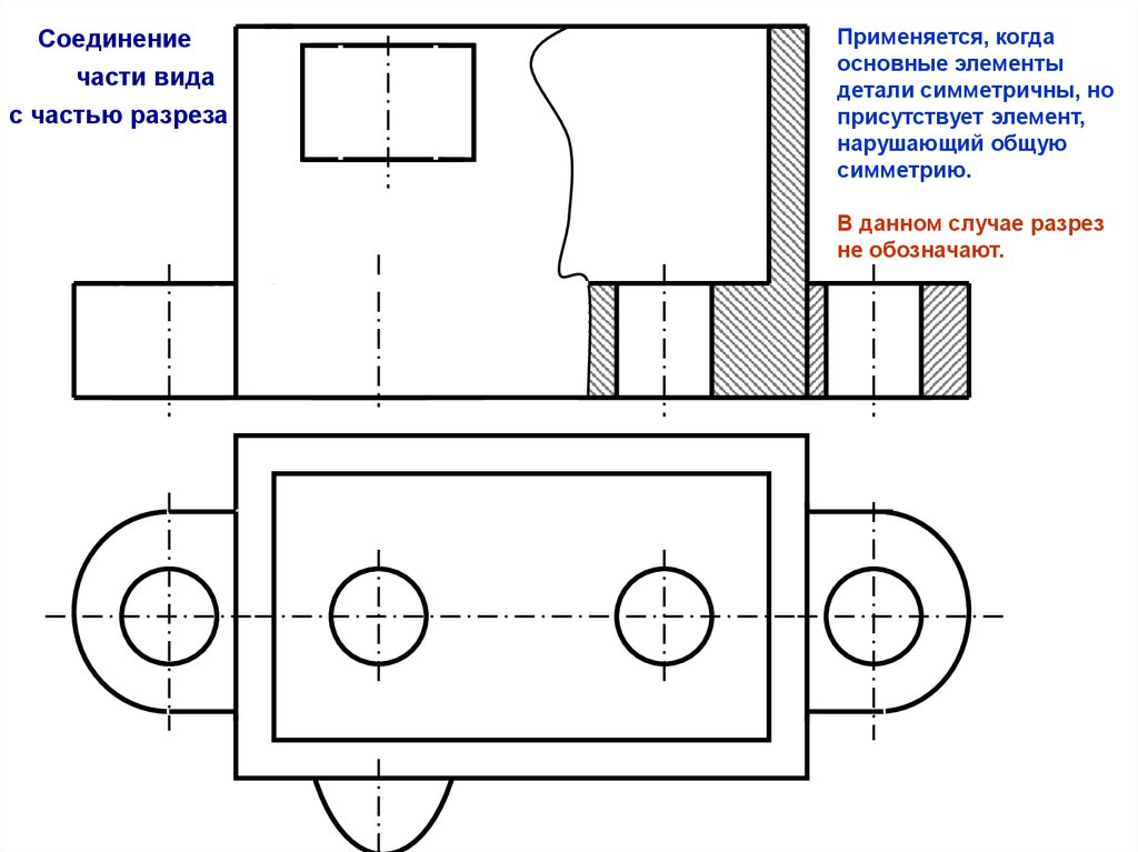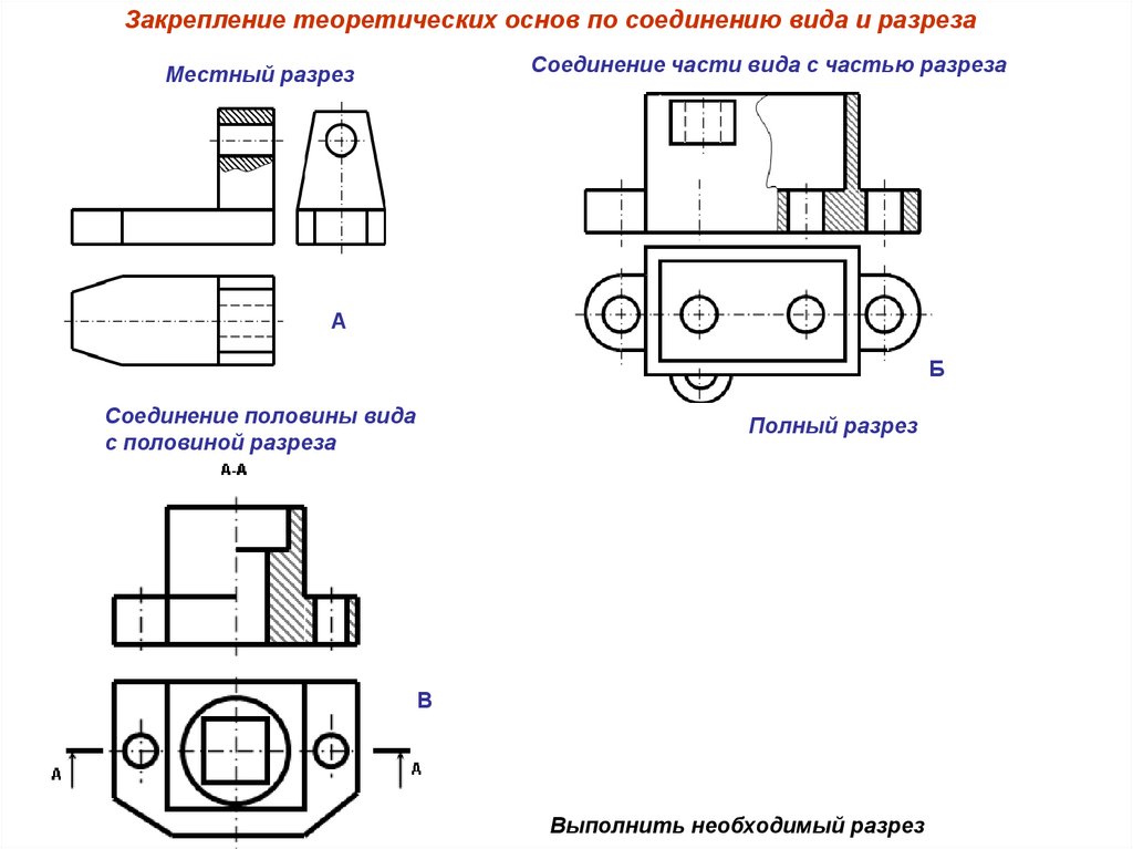 Закрепление теоретических основ по соединению вида и разрезаСоединение части вида с частью разреза
