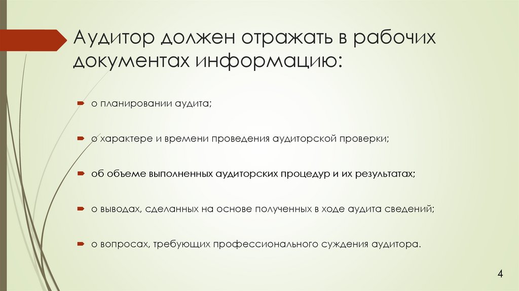 Аудитор должен отражать в рабочихдокументах информацию: