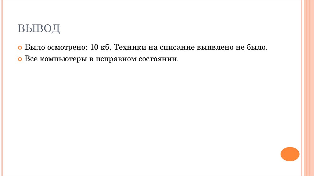 ВЫВОДБыло осмотрено: 10 кб. Техники на списание выявлено не было.