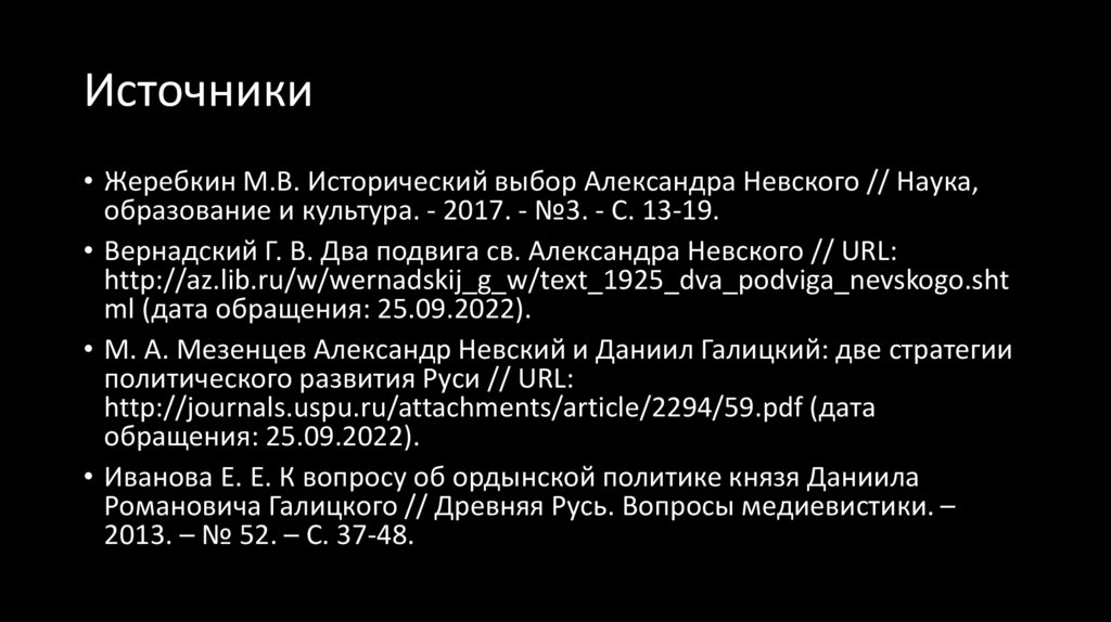 Источники• Жеребкин М.В. Исторический выбор Александра Невского // Наука,