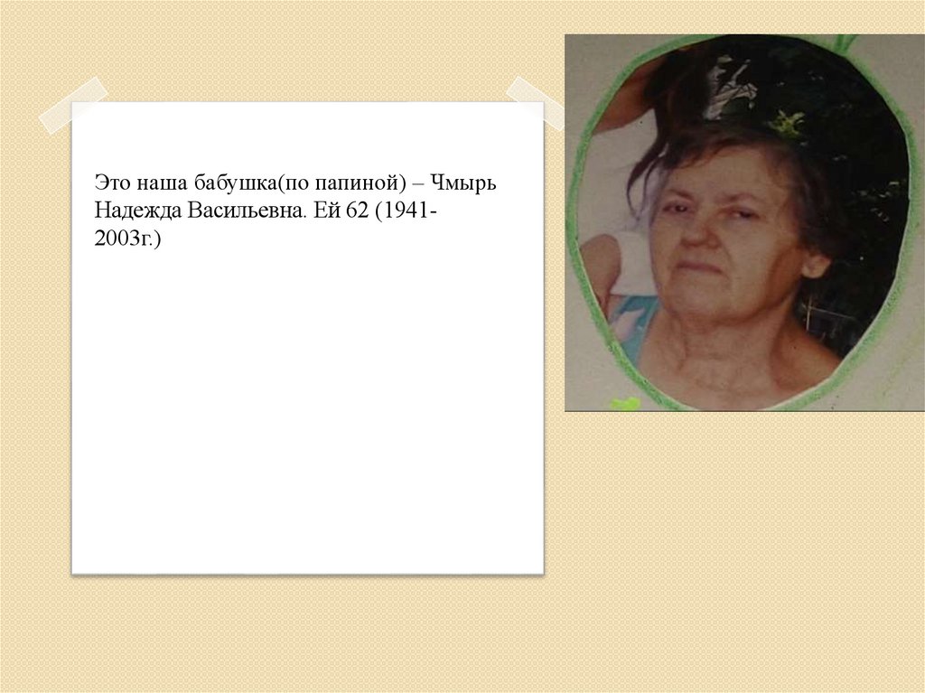 Это наша бабушка(по папиной) – ЧмырьНадежда Васильевна. Ей 62 (19412003г.)