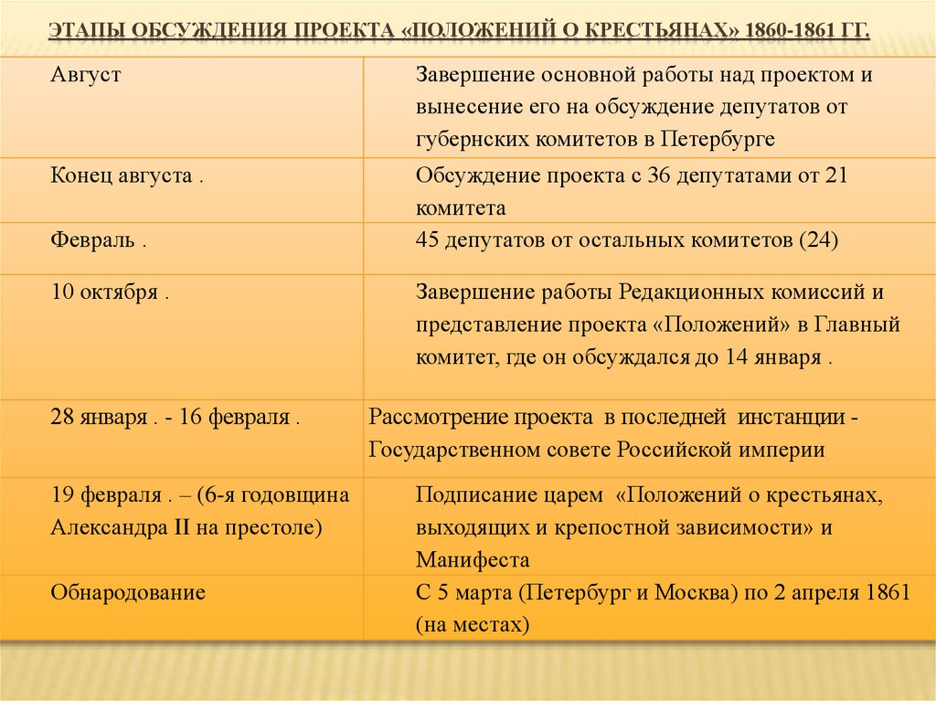ЭТАПЫ ОБСУЖДЕНИЯ ПРОЕКТА «ПОЛОЖЕНИЙ О КРЕСТЬЯНАХ» 1860-1861 ГГ.Август