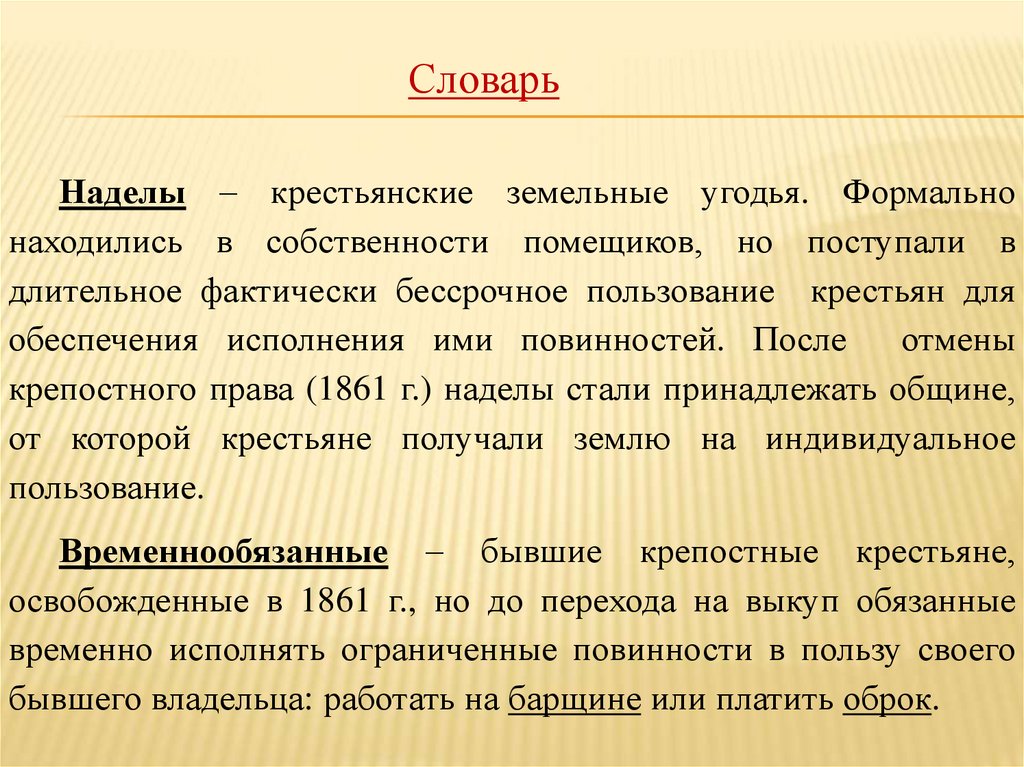 СловарьНаделы – крестьянские земельные угодья. Формально