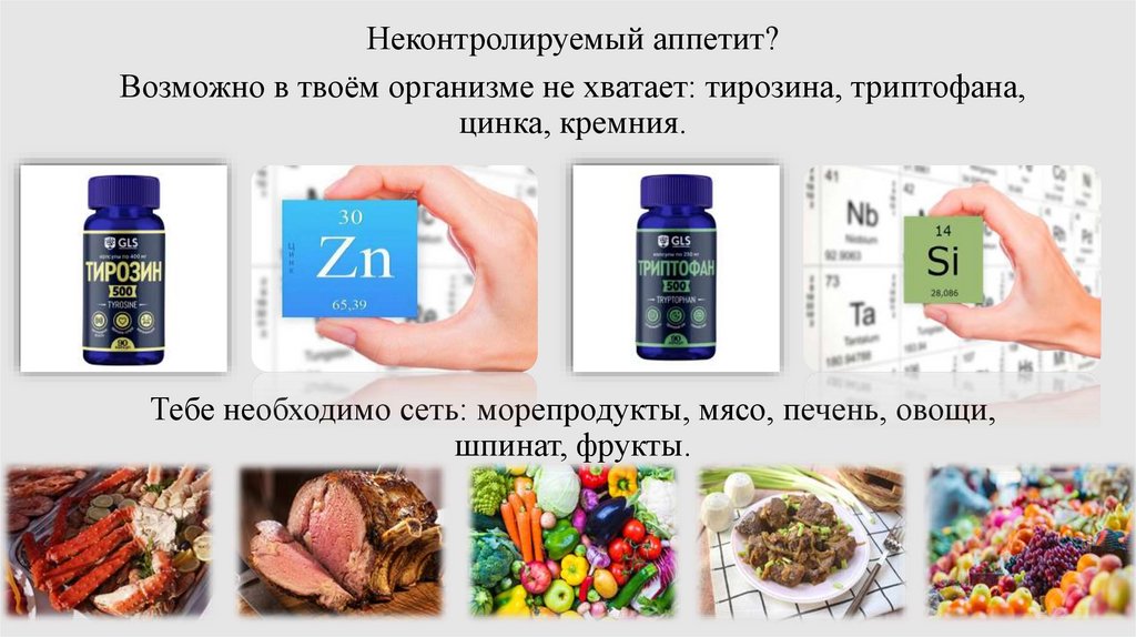 Неконтролируемый аппетит?Возможно в твоём организме не хватает: тирозина, триптофана,
