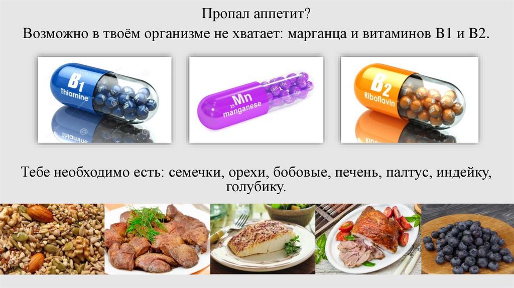 Пропал аппетит?Возможно в твоём организме не хватает: марганца и витаминов B1 и B2.